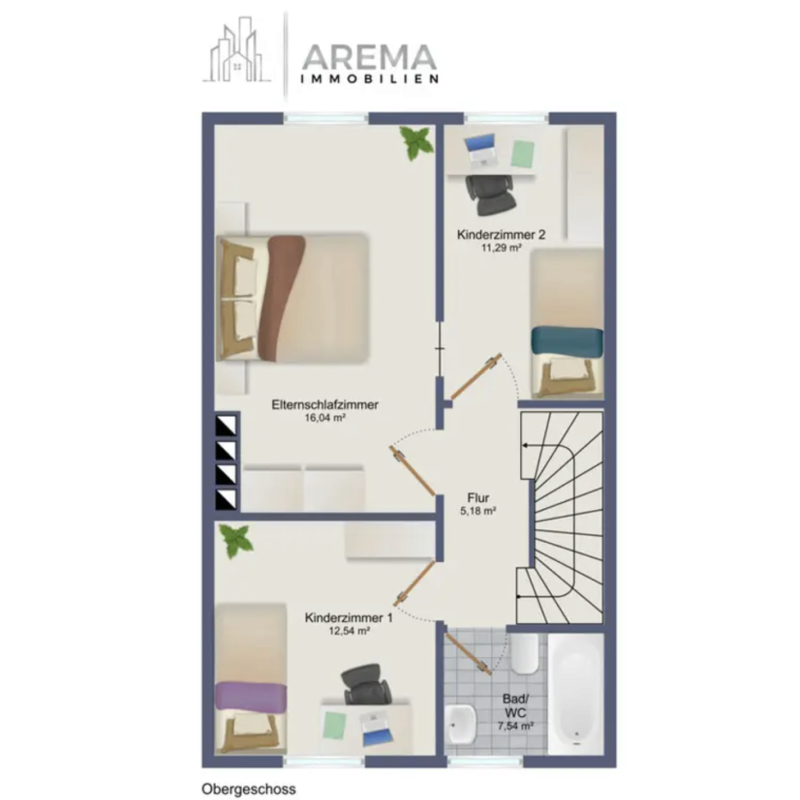 Über eine offene Treppe kommt man in das 1. Obergeschoss mit drei gut geschnittenen Zimmern mit Vinyl-Boden und einem Tageslichtbad-Duschbad.